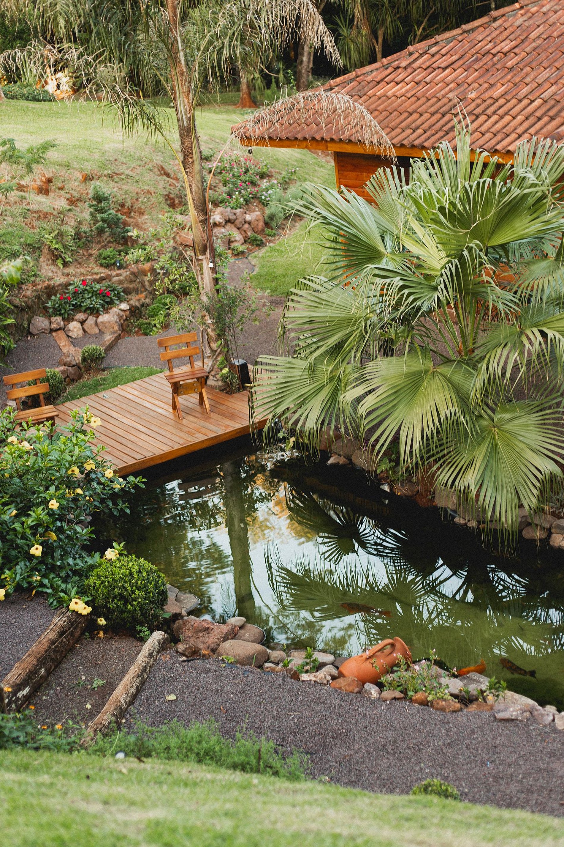 A lateral da casa revela um charmoso lago com um pequeno deck, onde peixes ornamentais deslizam em meio a plantas aquáticas, criando um ambiente de serenidade e contemplação, onde é possível alimentar e tocá-los. Do outro lado, um rio preguiçoso com sua melodia suave completa a sinfonia da natureza, oferecendo uma trilha sonora relaxante para a estadia.